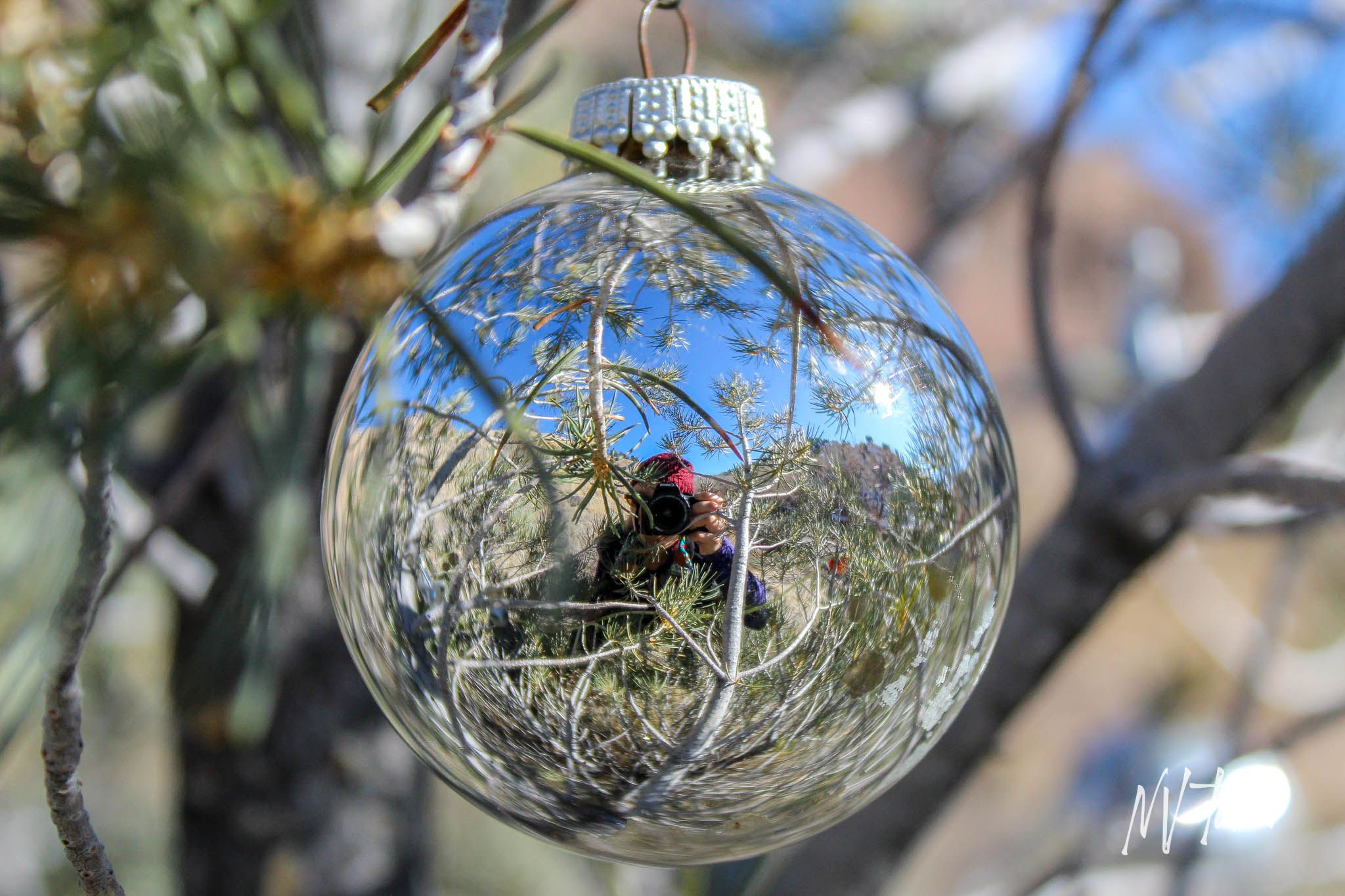 I found this tree by Butters Mill (Virginia City) decorated for Christmas. I was trying to get the mountains reflecting on the ornament but couldn’t get me out of the way. It turned out to be one of my favorite photos. Hubby was wondering what on earth I was doing climbing into a tree, but he has seen me do stranger things for a photo.