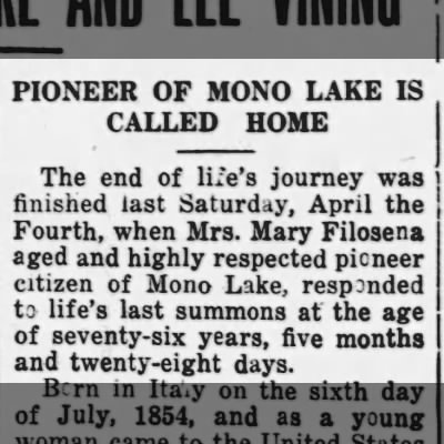 Mary died in 1931 and was buried next to Joe at the Mono Lake Cemetery.